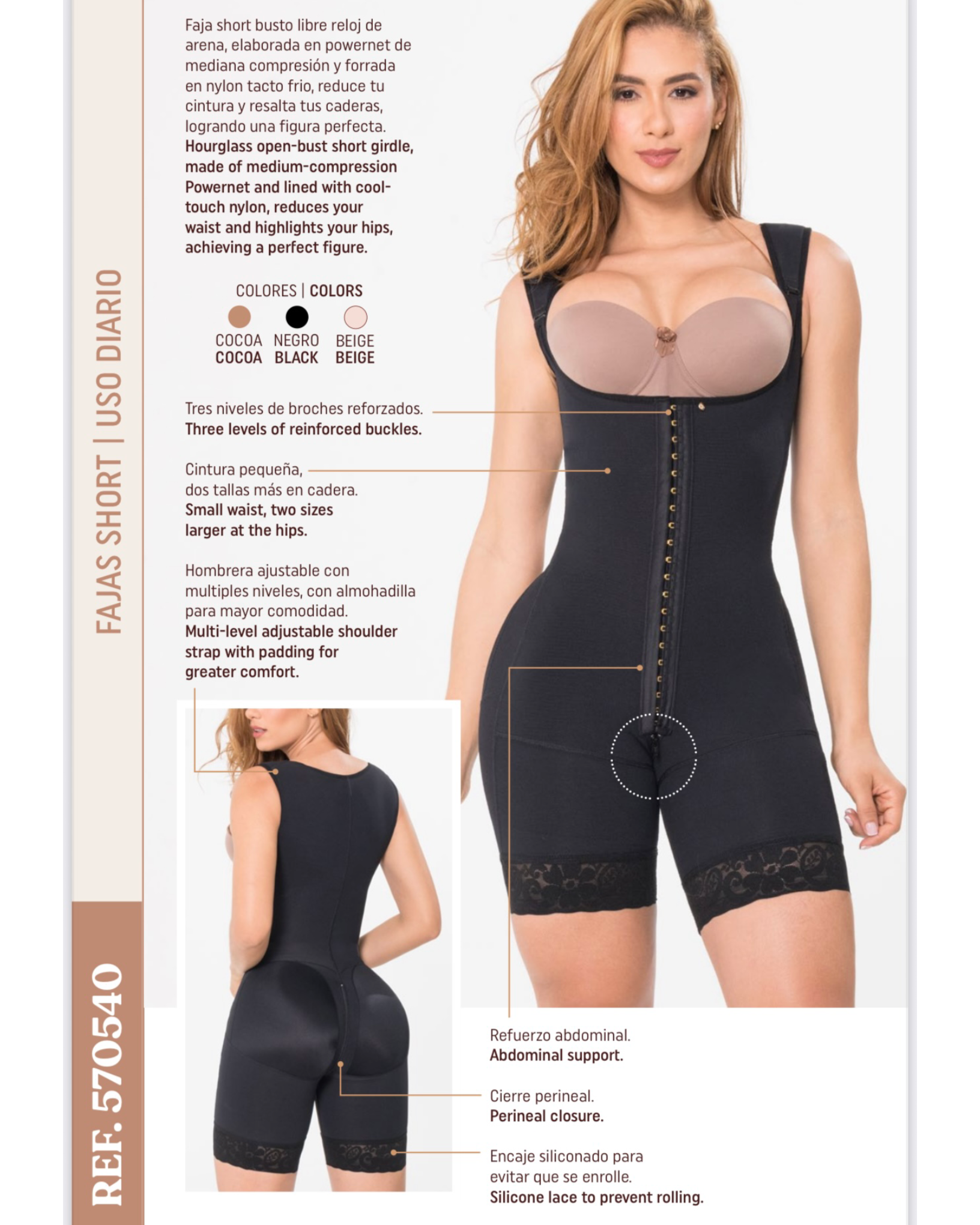 Faja short busto libre (estilo hourglass) de uso diario, de compresión media en Powernet y forrada con nylon de tacto frío. Reduce la cintura y realza las caderas para una figura definida.