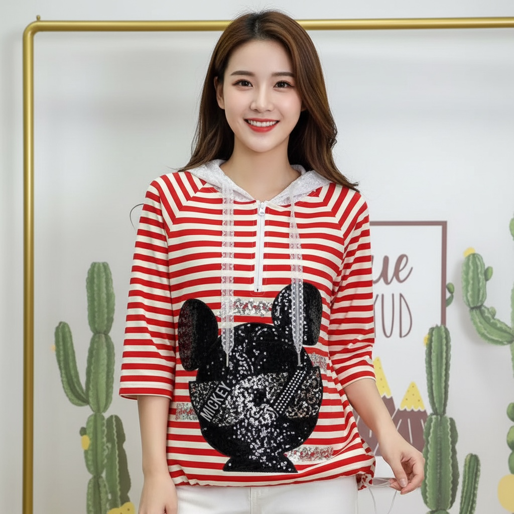 Blusa fashion con stretch one size queda de una S a una L con decoración en lentejuela y brillo, gorro en encaje